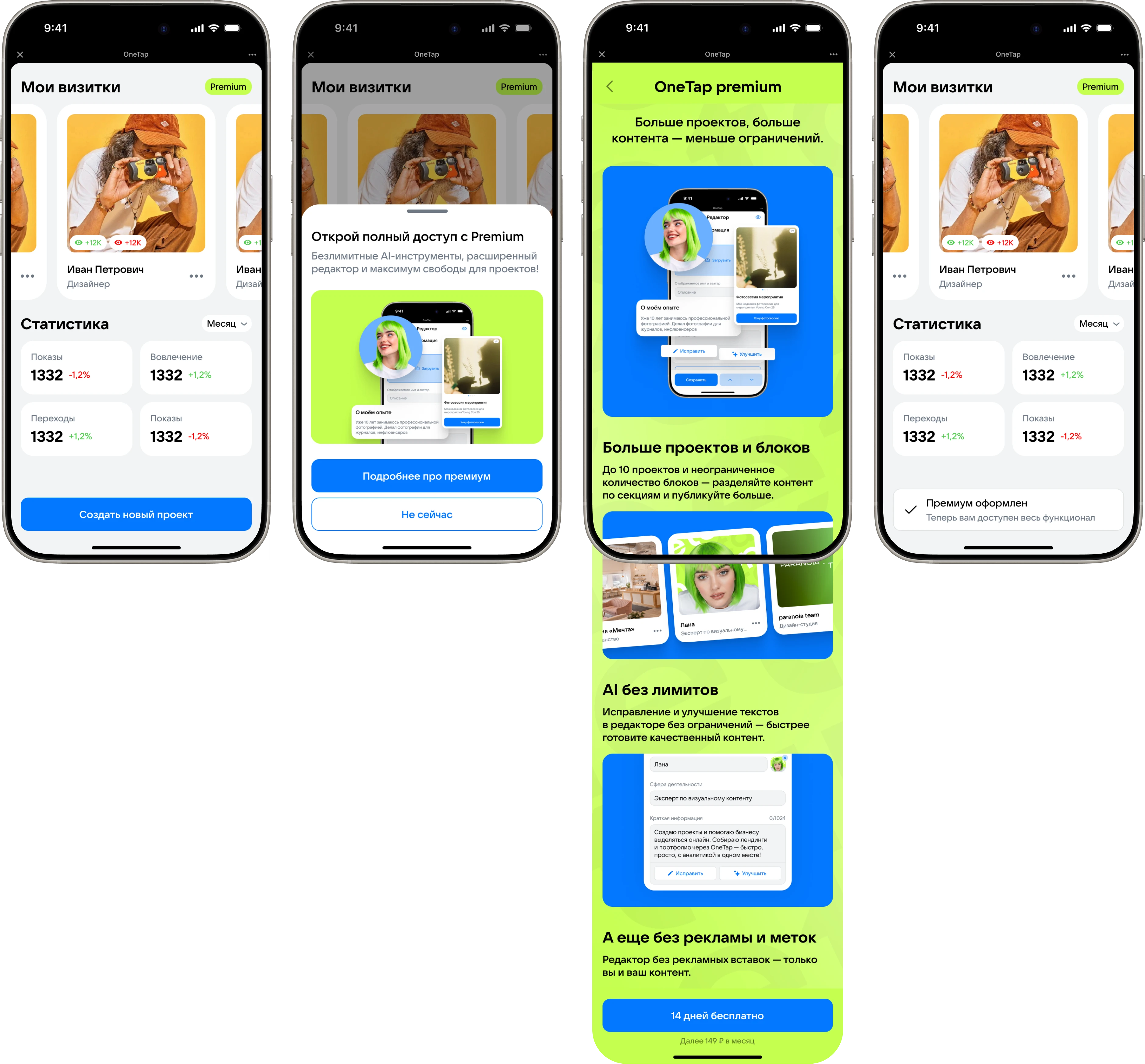 Виральная метка — надпись «Создано в OneTap» на каждой визитке органически продвигает сервис.