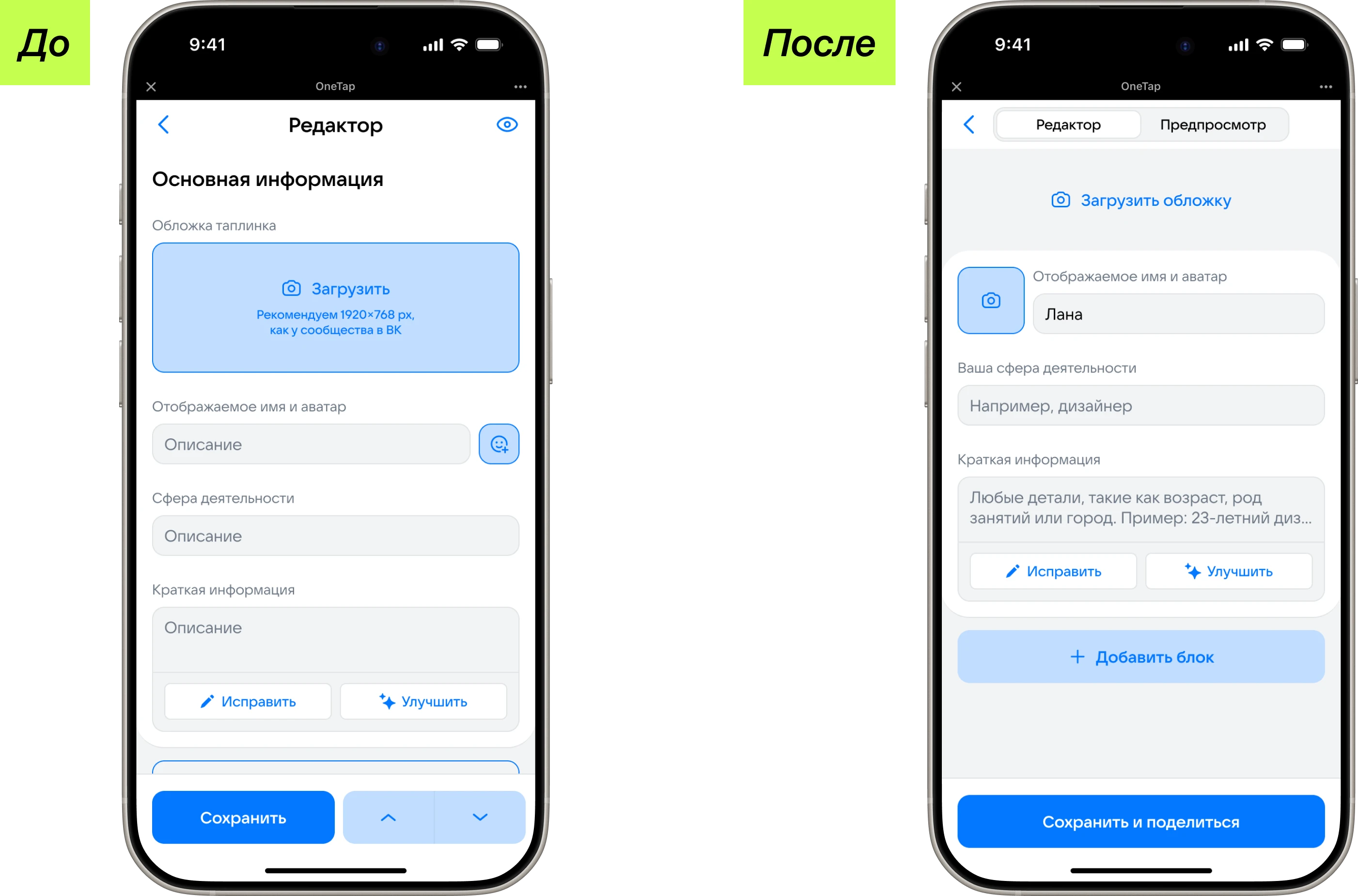 Ключевая находка — проблема с аватаром. Изначально фото профиля располагалось справа от поля ввода имени. Пользователи не понимали, что на него можно нажать — процент смены аватара был крайне низким, а визитки оставались незаполненными. Решение — вынести аватар наверх, сделать его главным элементом экрана заполнения. После изменения процент заполненных визиток вырос