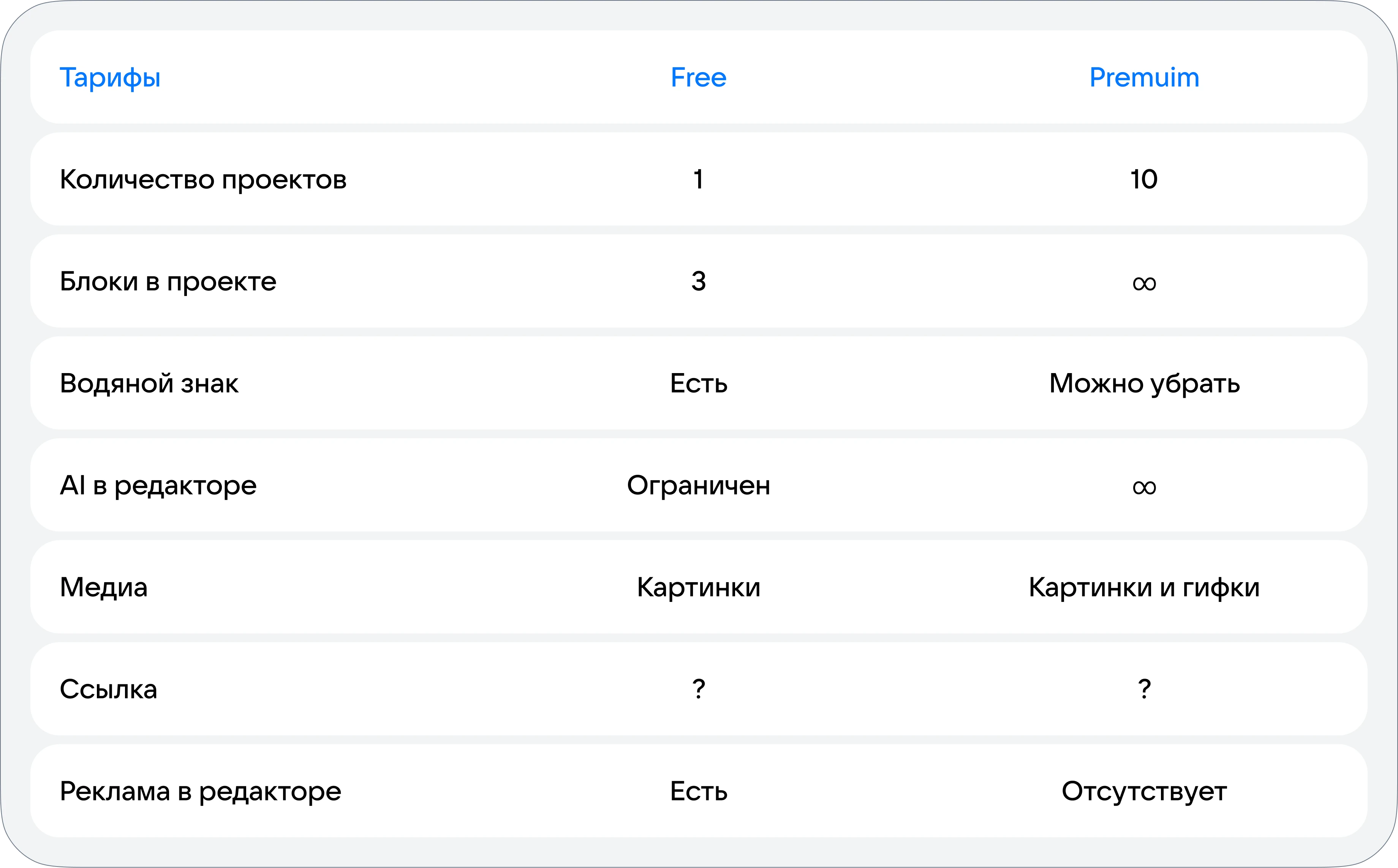 Premium: до 10 проектов, без ограничений по блокам, без водяного знака, без рекламы, гифки и расширенный AI.