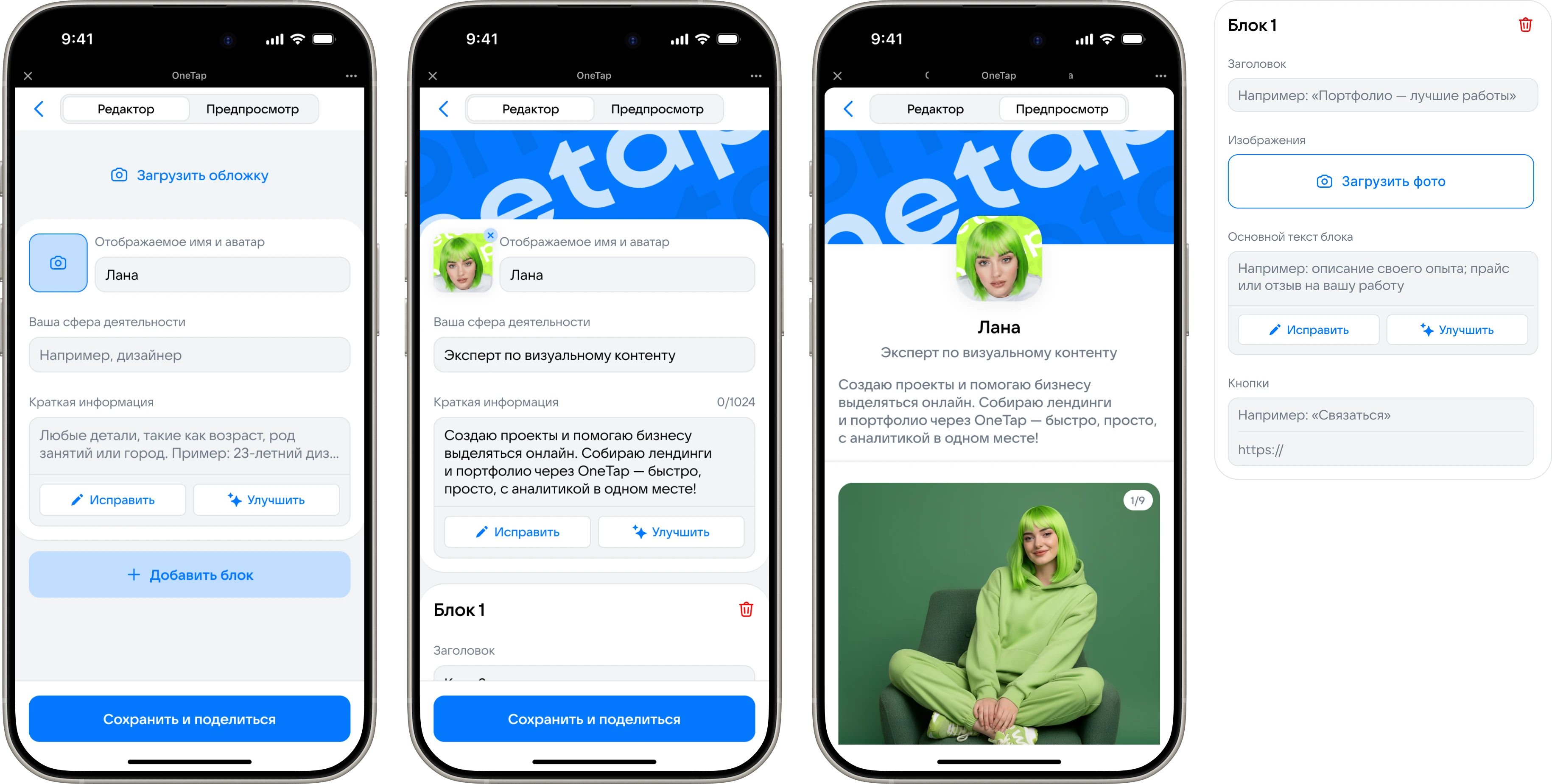 Блоковая система редактора. Самой сложной механикой стал редактор визитки. Нужно было дать пользователю гибкость — и при этом не перегрузить интерфейс. Решение: блоковая система с ограниченным набором полей в каждом блоке (заголовок, изображение, текст, кнопка). Из таких блоков можно собрать практически любую структуру — 4 кнопки, галерея с описанием, текстовый блок с CTA. Это позволило сделать MVP быстро и при этом дать пользователю реальную свободу.