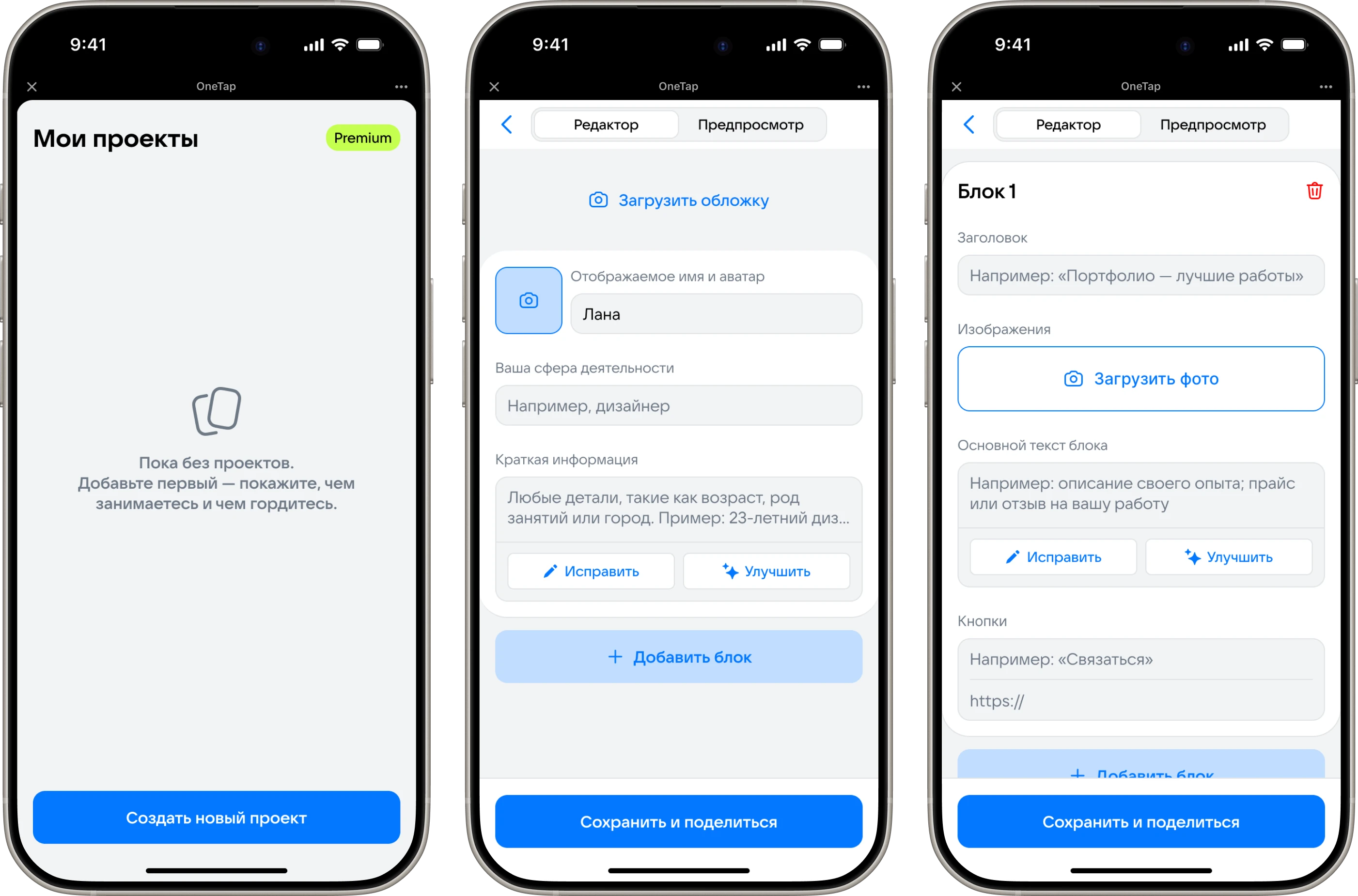 В рамках конкурса VK Dev Grants была разработана замена Taplink на базе VK Mini Apps — приложение-визитка для малого бизнеса, ИП и самозанятых. OneTap позволяет создать уникальную страницу из профиля ВКонтакте в один клик, настроить её под себя и поделиться с клиентами как внутри ВК, так и за его пределами.