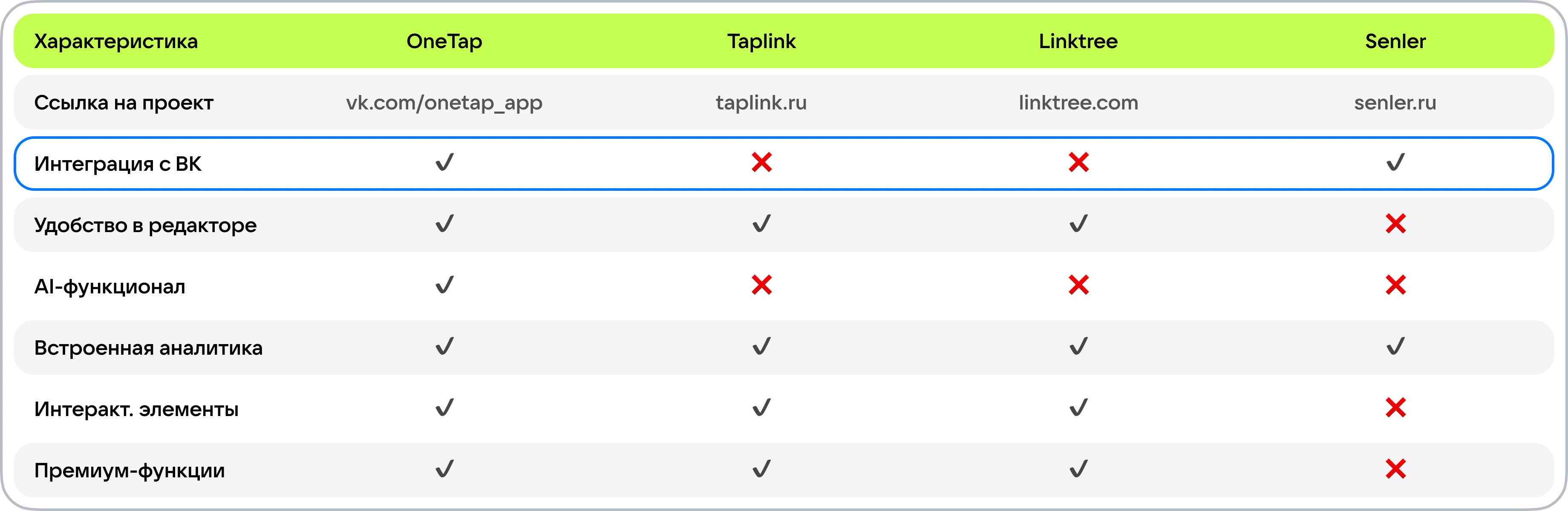 Анализ конкурентов показал, что рынок решений для лендингов и визиток охватывает широкий спектр потребностей — от простых стильных страниц (Tap.bio) до многофункциональных маркетинговых платформ (HubSpot, GetResponse). Успешный продукт в этой нише должен либо закрывать узкую потребность максимально просто, либо предлагать комплексные интегрированные решения. OneTap выбрал первый путь — максимальная простота внутри знакомой экосистемы ВКонтакте.
