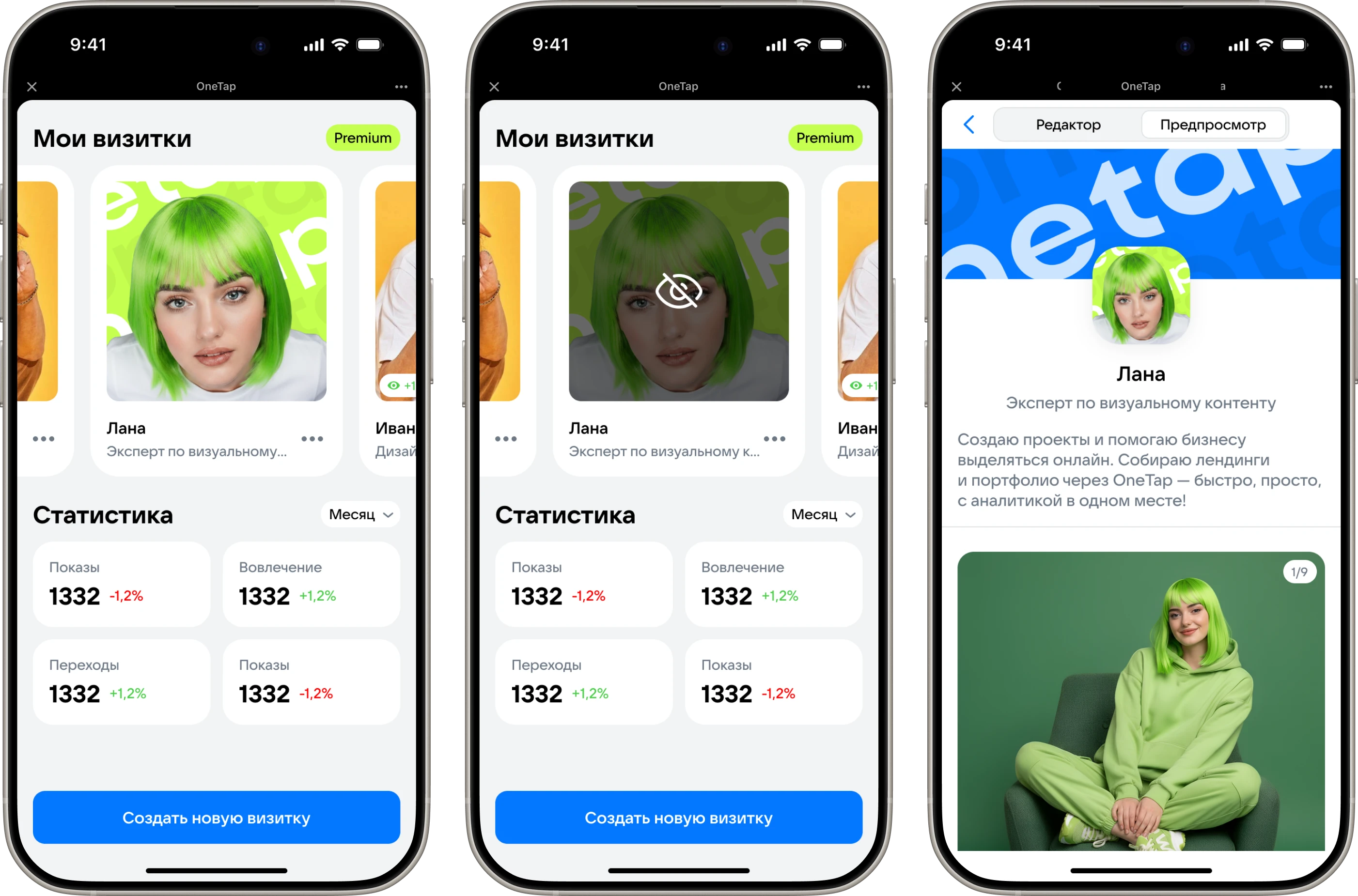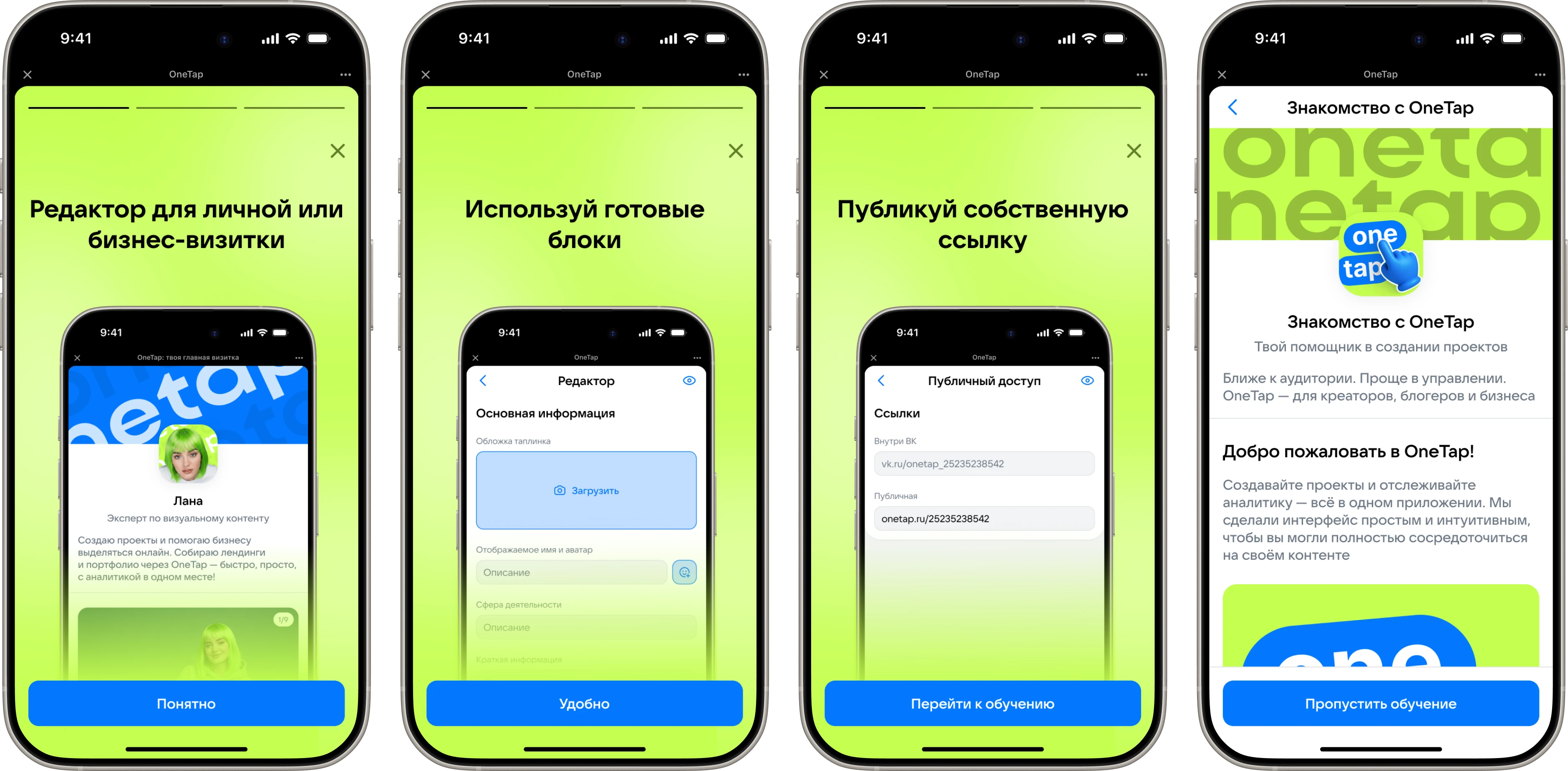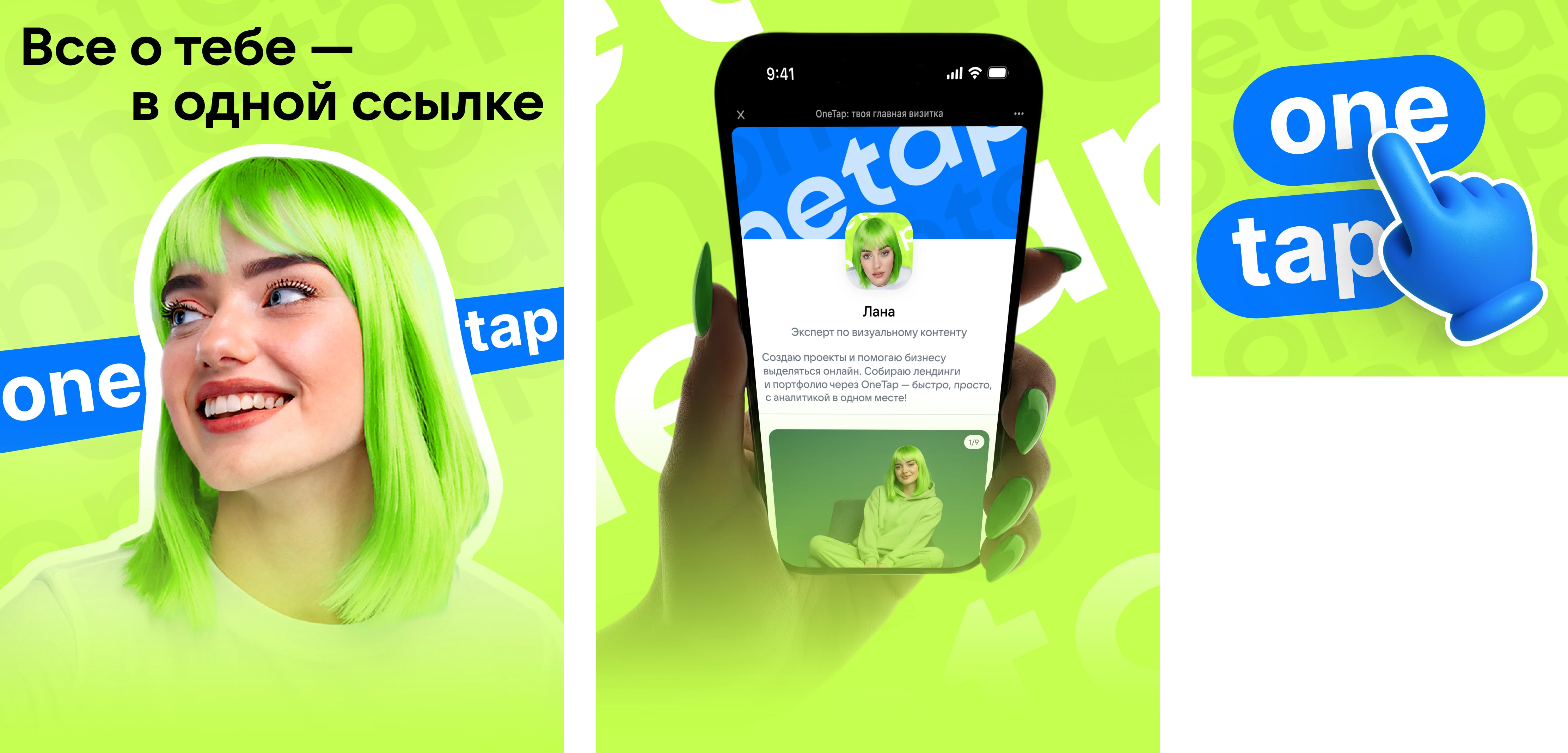 Визуальный стиль. Приложение построено на минимализме — весь акцент намеренно смещён на контент, который создают сами пользователи. Интерфейс не конкурирует с визиткой, а служит инструментом. При этом сам бренд OneTap получил яркий, запоминающийся стиль: насыщенный зелёный цвет, крупная типографика, характерный логотип с рукой — всё это создаёт узнаваемый образ, который не теряется среди конкурентов.