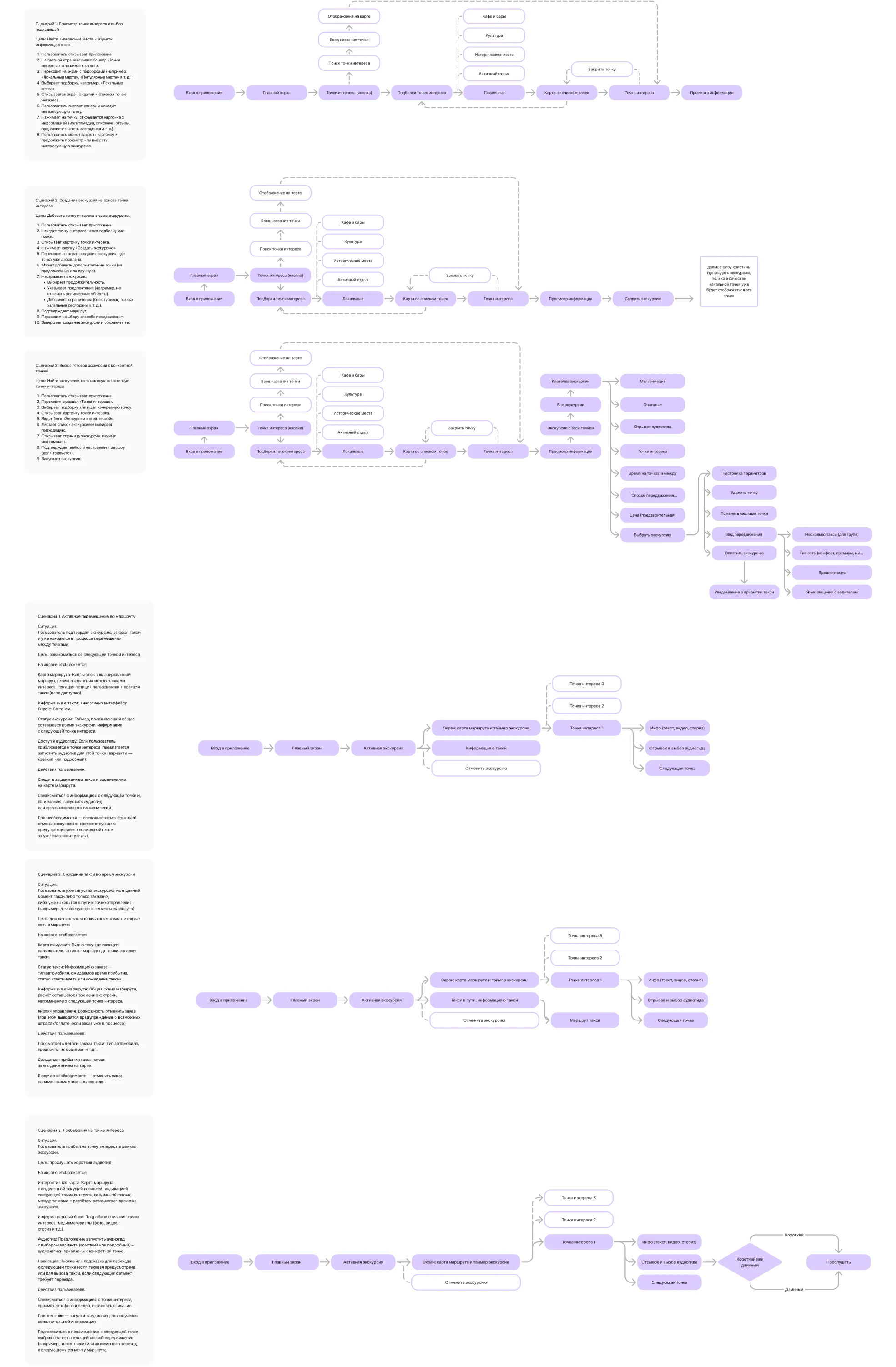 Далее построили информационную архитектуру приложения и user flow. Я занималась экранами «Точки интереса» и «Активная экскурсия»